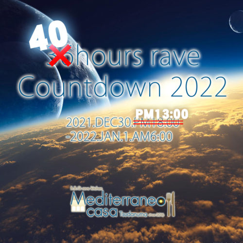本日12月30日木曜日のメディテラは!遂にやってきました!36hoursもとい「40hours rave Countdiwn 2022」!!先日もブログでお話しした通り、世情により、開催そのものが危ぶまれていたこの、超絶年越しも、みなさんのお声にこたえ本日より敢行致します!思えばミッションズの頃、高円寺のタイ料理屋でスタッフ飲み会をしていて、俺が、「どこのライブハウスにも絶対負けないインパクトのある事をやりたい!」と言いだして、やり始めたこの企画、昨年出来なかったので、今年で11年目。通算本数10回目の開催となります!色々な思いがありますが今年開催できたことを心からお礼申し上げます!さあ、2022年を迎える支度はいいですか?!一緒に新年まで吞み明かしましょう!
