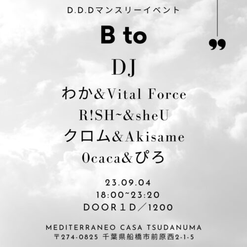 - DJサークル「D.D.D」9月のマンスリーイベント、今回の担当はぴろだ。人脈を生かし所属サークルである法政宅録同好会(法政大学),ソフトメディア研究会(千葉工業大学)からDJをピックアップ。B2Bにフォーカスした次世代のイベントを築く。