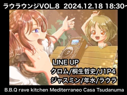2024年12月12日(木) TITLE のんちゃんと手巻き寿司。 ORGANIZER B.B.Q rave kitchen Mediterraneo Casa Tsudanuma(担当のんちゃん) GENRE All good music EVENT THEME Food fair-フードフェア ADMISSION 300(演者/0)※ご飲食につきましては1杯目とお通し代をセットで1200いただいておりますので最初にご注文ください。 START 18:00 CLOSE 23:59 DJ オレンジ電気/音斬乱風/ねこ爺/みろ_999/Noble-X/YAMATO/しゅか/シン/KOHEY/Cocci VJ オレンジ電気 FLOOR STYLE Seating AMBIANCE Delicious-美味しい ACCOUNTING Cash on DESCRIPTION のんちゃんが食べ放題イベントに初挑戦!!フォロースタッフでは何度も入ったこあるけど、どうなることやら…量が足りるかなど不安はいっぱいありますが、楽しみたいと思います!余ってたらのんちゃんも食べちゃうぞ♡笑 TIMETABLE 18:30-19:00 オレンジ電気