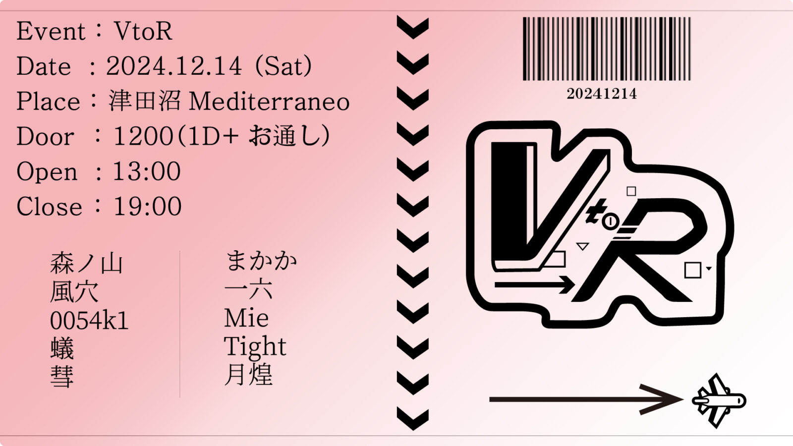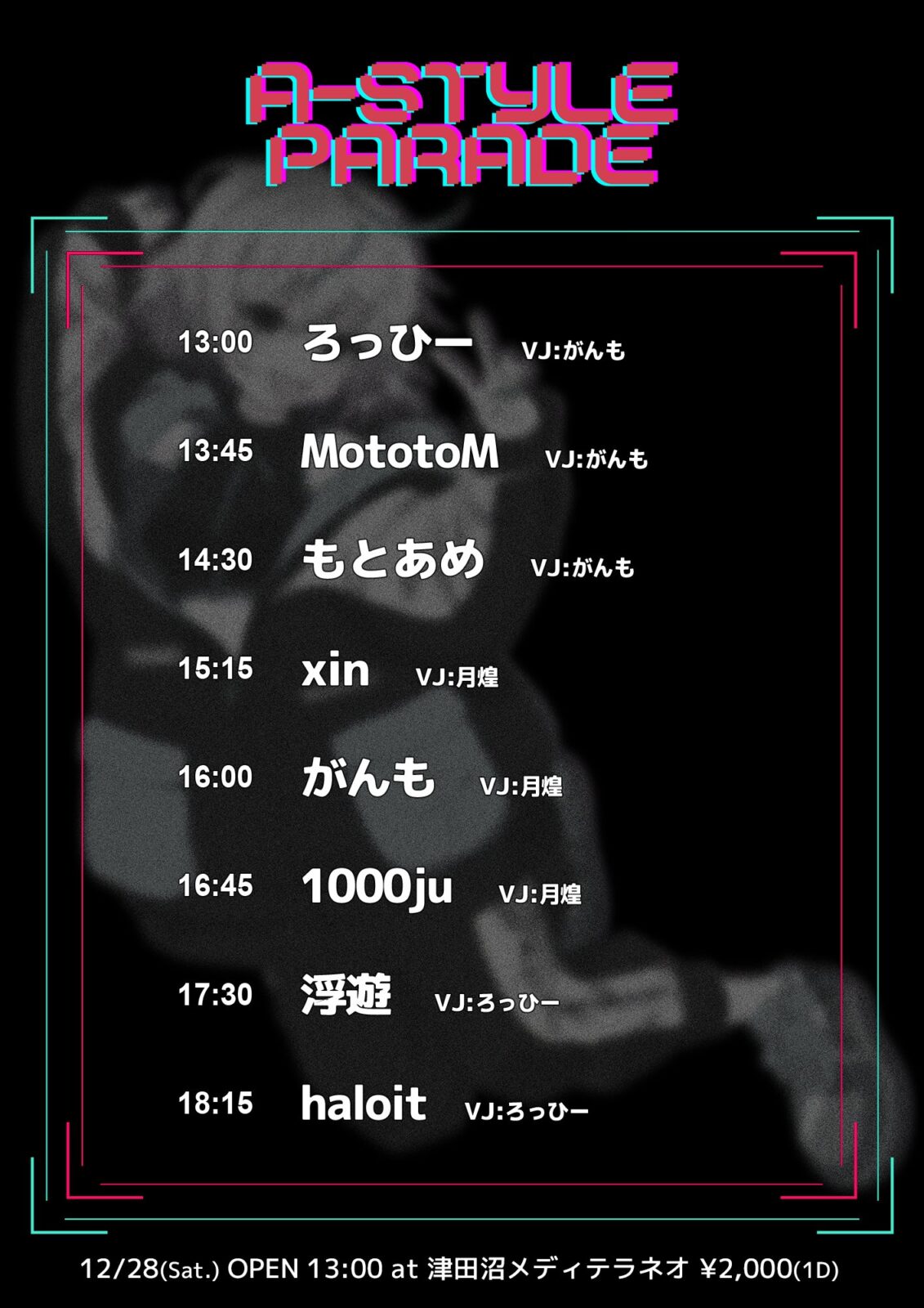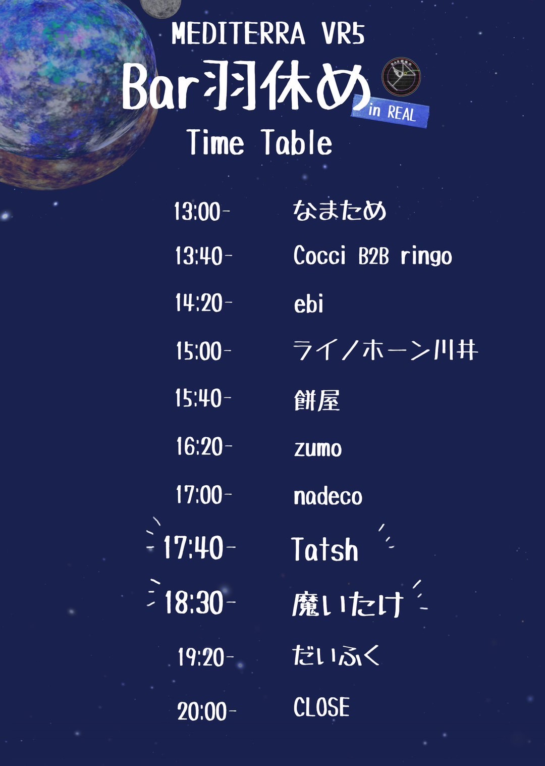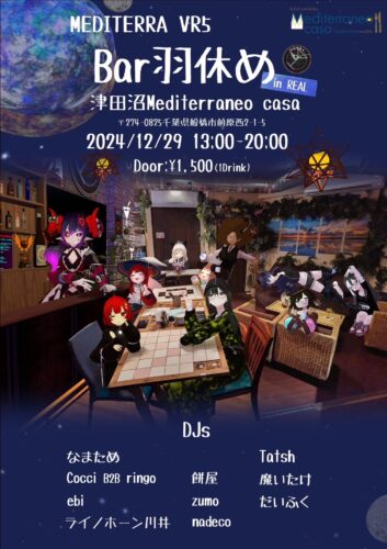 2024年12月10日(火) TITLE ぜーんぶかっこかわいい!! NIGHT☆FIVER ORGANIZER Revy、クロム GENRE Electro House,Progressive House,Bounce,future bass etc… EVENT THEME Birthday-誕生日 ADMISSION 300(演者/0)※ご飲食につきましては1杯目とお通し代をセットで1200いただいておりますので最初にご注文ください。 START 18:00 CLOSE 23:59 DJ KIGMA/KAZUKI/GWERCY/POSTMAN/にゃめる/ mahiro./シン/クロム/Revy/G-NES/MR.BLACK/ジャスミン VJ CALPICO FLOOR STYLE Standing AMBIANCE lively-賑やか ACCOUNTING Cash on DESCRIPTION Revy Night☆Disco × ぜーんぶかわいい!! から 「ぜーんぶかっこかわいい!! NIGHT☆FIVER」 開催決定!! 私のリアルバースデーということで特別コラボイベントを行います! kawaiiとEDMのコラボはあまりない(?)のでぜひ皆様遊びに来てください! TIMETABLE 18:00〜18:30 KIGMA