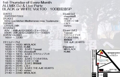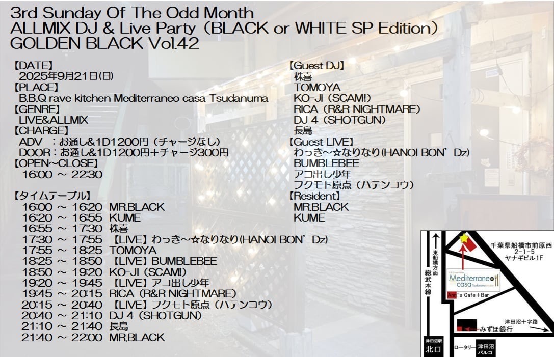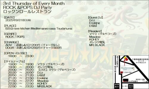 - 世間には千葉ロックという言葉があり、千葉県はロックバンド全国ツアースタートの地であり、多くのバンドシーン、ロックミュージシャンを輩出してきた。また幕張メッセをはじめ数多くの海外アーティストの日本上陸の会場となってきた。千葉に数多く眠るロック魂を掘り起こし、津田沼で最高の夜を過ごそう!今回は大人の都合により、平日縮小会!だけどラインナップは濃厚!!Jintatsunoが元々のロック畑をひっくり返して頑張ります!