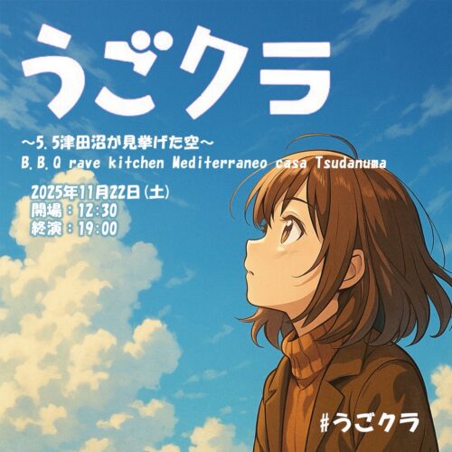 2025年11月22日(土) TITLE うごクラVol.5.5 ORGANIZER スファ(サブでマツメ) GENRE All オタク Music EVENT THEME Nard-オタク ADMISSION 1500 START 12:45 CLOSE 18:30 DJ スファ/マツメ/たった/しき/ジャスミン/はせべ/モモカゲ/ぷく/あぜなか VJ スファ、ぷく、たった FLOOR STYLE Standing AMBIANCE cheerful-楽しい ACCOUNTING Cash on DESCRIPTION うごクラ初の津田沼回! いつもとは雰囲気を変えて食事も楽しみながら盛り上がろう! TIMETABLE 12:45-13:25マツメ