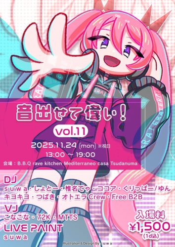 2025年11月24日(月) TITLE 音出せて偉い! vol.11 #オトエラ ORGANIZER ㌍㍍ GENRE All good Music EVENT THEME Music ADMISSION 1500 START 13:00 CLOSE 19:00 DJ s u w a / しょとー / 椎名てゃ / ココア /「くりっぱー/ゆん」/ キヨキヨ / つばき / オトエラCrew / Everyone(Free B2B) VJ こなこな / 72K / MTTS FLOOR STYLE Standing AMBIANCE cheerful-楽しい ACCOUNTING Cash on DESCRIPTION https://twipla.jp/events/701298