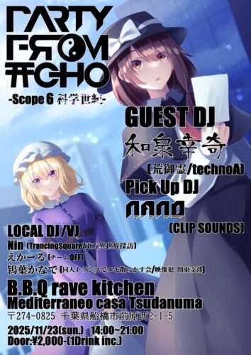 2025年11月23日(日) TITLE PARTY FROM TOHO -Scope6 科学世紀- ORGANIZER 和泉幸奇 GENRE All good music EVENT THEME Nard-オタク-東方 ADMISSION 2000円 (1ドリンク込み) START 14:00 CLOSE 21:00 DJ 和泉幸奇 (荒御霊) / NANO_TAN (CLIP SOUNDS) / Nin (TrancingSquare / 東方異世界探訪) / えかーる (チームOFF) / 鴇葉かなで (同人トランスでエモ散らかす会 / 映像犯 関東支部) / Cat-u / からすまん / ラム / 壱崎 影喜 VJ 鴇葉かなで / 壱崎 影喜 FLOOR STYLE Standing AMBIANCE Maniac-マニアック ACCOUNTING Cash on DESCRIPTION 『幻想郷の場所をめぐりながら、その場所の音楽を楽しむ』東方クラブイベント 【PARTY FROM TOHO】 幻想郷の各所を、音楽や映像に乗せてお届けします。 幻想郷を感じたい! そんなあなたにピッタリな空間を作り上げるDJイベントです。 第六回目となる今回は【科学世紀】! DJ,VJ陣それぞれの解釈にて科学世紀をイメージした空間をお届けします! TIMETABLE 14:00-14:40 ラム