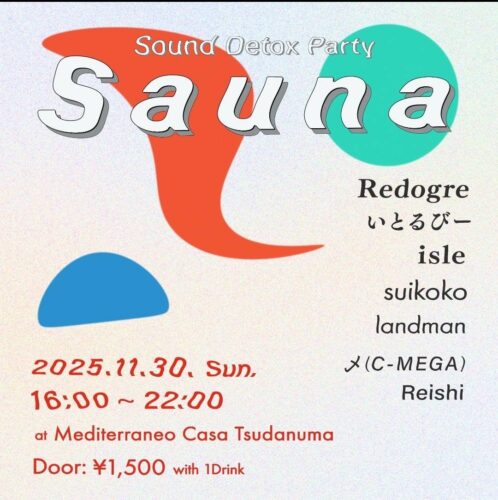 2025年11月30日(日) TITLE Sound Detox Party "Sauna" ORGANIZER landman GENRE All good Music EVENT THEME Party ADMISSION ¥1500(1ドリンク+お通し付) START 16:00 CLOSE 22:00 DJ RedOgre/いとるびー/aisle/suikoko/landman/〆(C-MEGA)/Reishi FLOOR STYLE Seating AMBIANCE excitement&calm ACCOUNTING Cash on DESCRIPTION ハードとチルアウトが交差し、音でととのうことを目的としたデトックスパーティ「Sauna」。サウナ、水風呂、外気浴というととのうための3要素をイメージし、Brostep, Hardtechno, Speedcoreといったハードなサウンドから、Vaporwave, Ambientのようなチルアウト向けの音楽、そしてAtmospheric DnBといった開放感のあるジャンルまで網羅しており、最初から最後まで楽しめるオールジャンルパーティになっている。ぜひ早い時間帯からお越しいただき、音を通して日々の疲れを取りに来てほしい。 スケジュールは登録されておりません。
