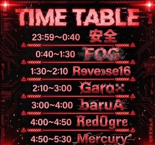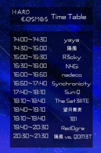 - kors k/ナウい女/hiro B2B natori/Ray B2B ZAKKY/Nico B2B しゅか/ SyllaBass B2B Fatapia/音斬 乱風 B2B 望月 舞夜/ogiyaku/はらりゅう
