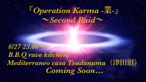 - 【予測不能、前人未到のHARD SOUND PARTY】 13年の時を経て再び既存のジャンル、形式など全てぶち壊し思うがまま新しいカタチを創造する為に、コンセプトをHARD&DARKを主体とした高速BEATで天を裂き、地を駆け抜けるHARDSOUNDを提供するPARTYがやってくる。 それは『Operation Karma-業-』 13年ぶりとなる今回は国内外各地で活躍しているBound Round (ENIGMA)を招待!! 国籍を越えた世界に通づるSoundを体感せよ また、集った面々も各々がイベント主催をしていた強者達!!! 昨今の日本では滅多にお目にかかることができないHARDSOUNDが提供されることを約束しよう。 全ての形式に捕われず、自らの創造した道を進み歩む...
